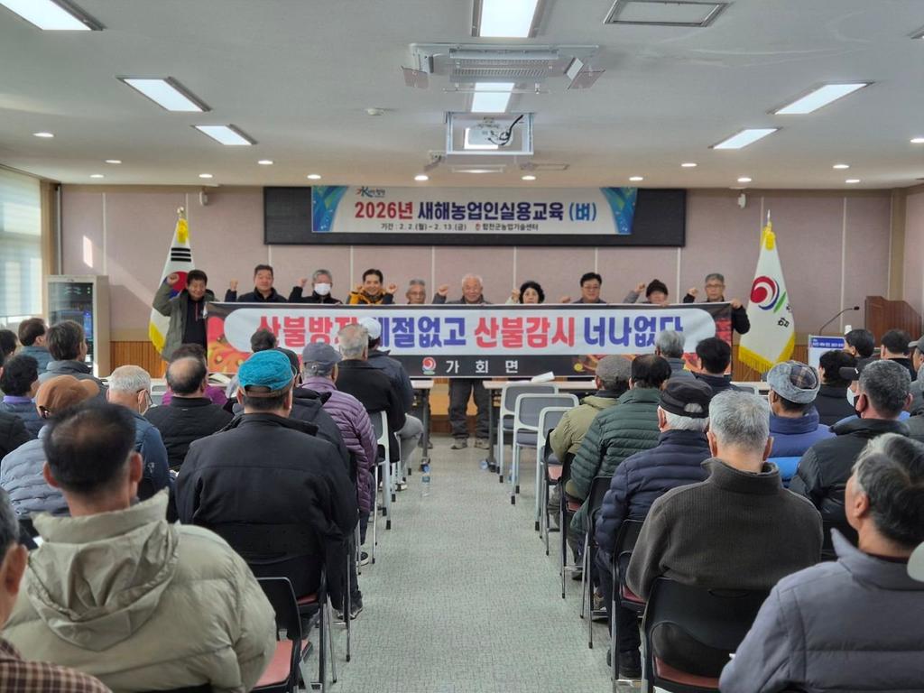 합천군 가회면(면장 조홍숙)은 13일 오전 9시 30분 가회면사무소 2층 회의실에서 열린 ‘2026년 새해농업인 실용교육(벼)’ 현장에서 교육생을 대상으로 산불 예방 홍보 활동을 실시했다.