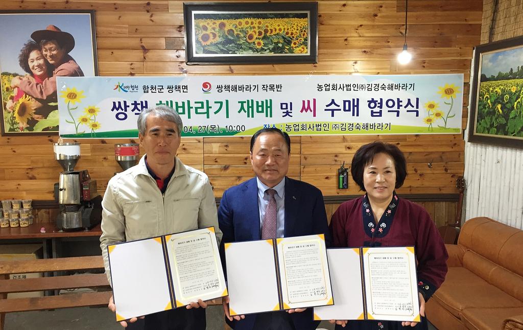 합천군 쌍책면(면장 김학중)은 27일 오전 제주시 소재 ㈜김경숙해바라기 농장에서 쌍책해바라기작목반, 농업회사법인 ㈜김경숙해바라기와 쌍책해바라기 재배 및 씨 수매에 관한 업무협약을 체결했다.