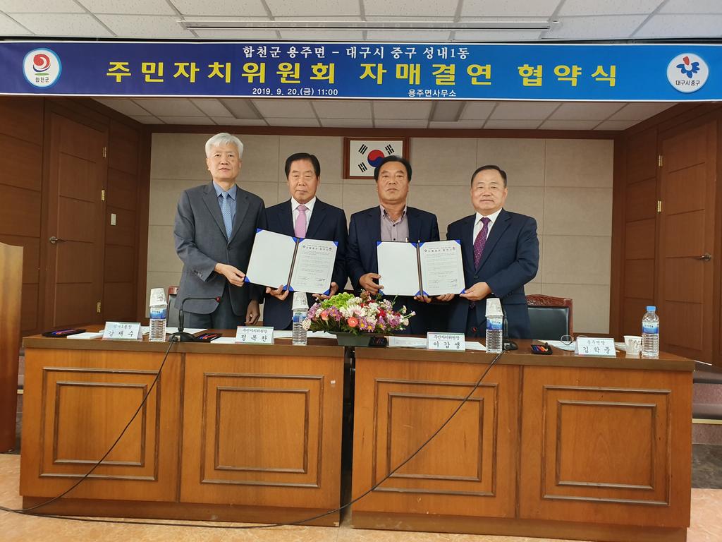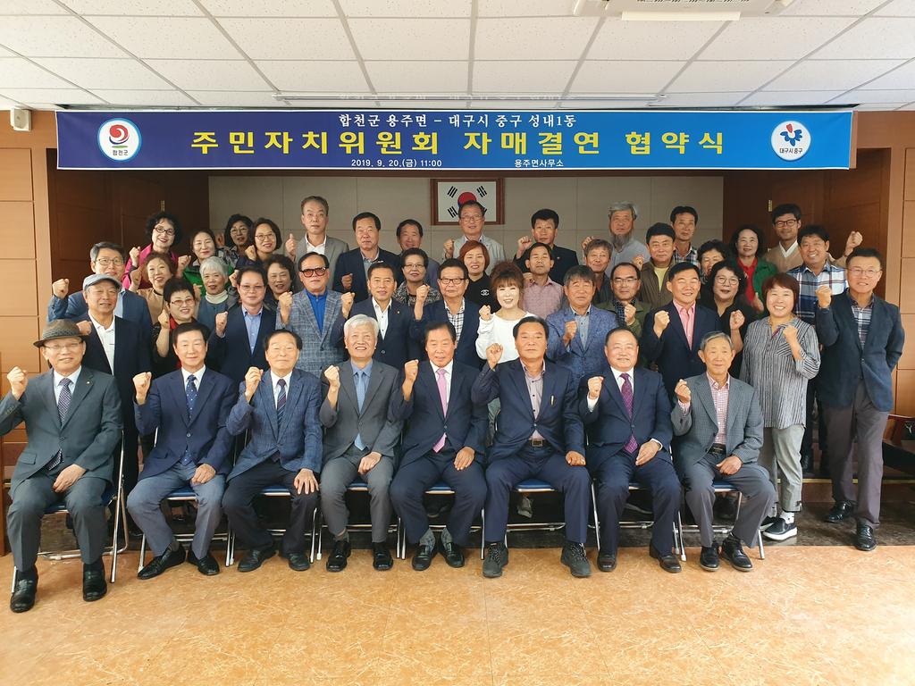 합천군 용주면 주민자치위원회(회장 이갑생)는 20일 용주면사무소에서 용주면과 성내1동 주민자치위원, 지역사회단체장 등 60여명이 참석한 가운데 대구시 중구 성내1동 주민자치위원회와 자매결연 협약식을 개최했다.