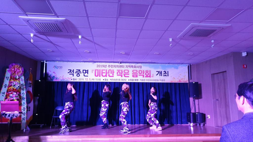 그 외에도 적중주민의 열정적인 하모니카·색소폰·기타연주 그리고 화려한 피날레를 장식한 미타산놀이패 ‘야시들’의 장구난타 등 다양한 분야의 팀이 출연하여 90분간 면민들과 함께 감동의 선율을 나누었다.