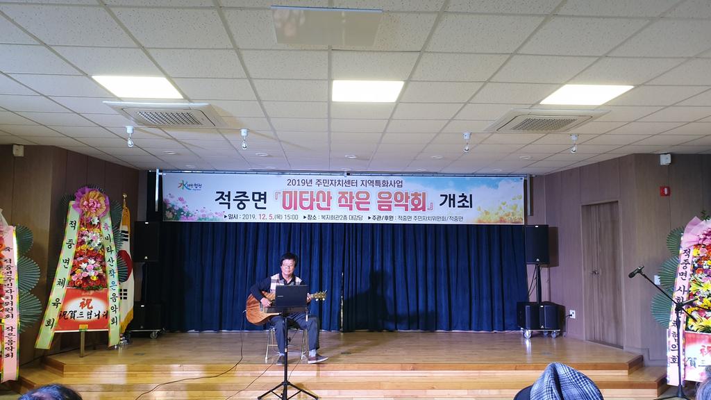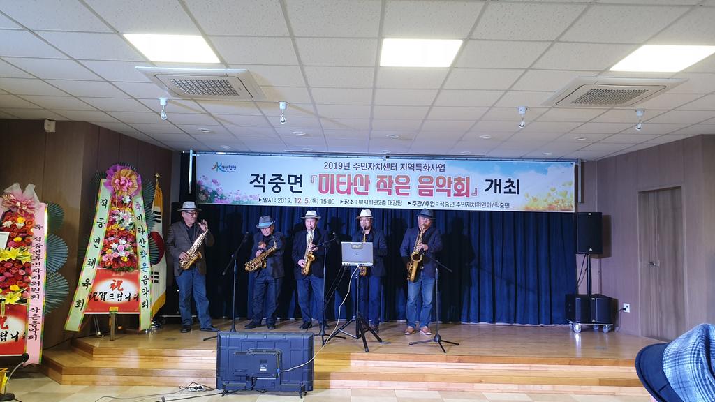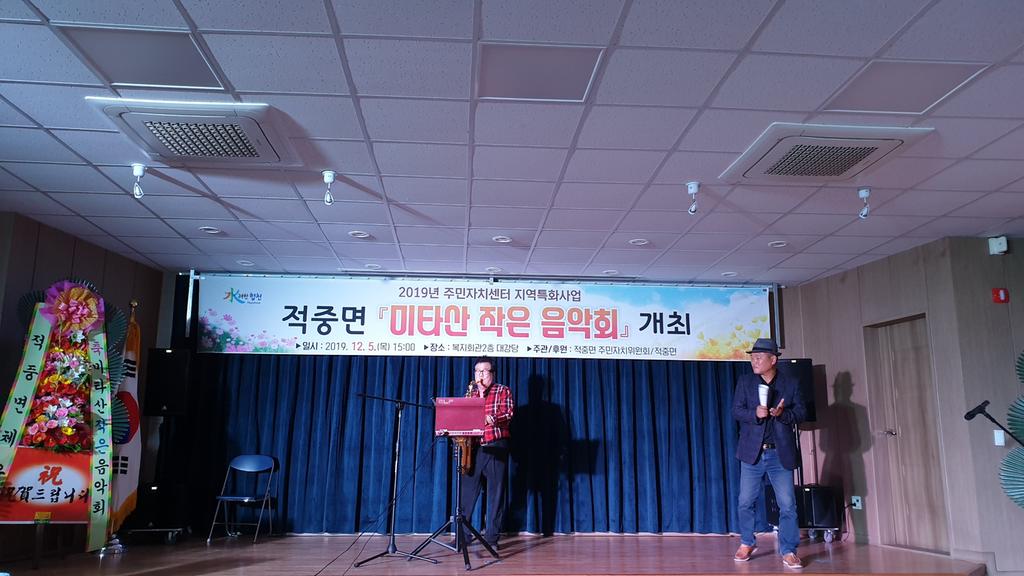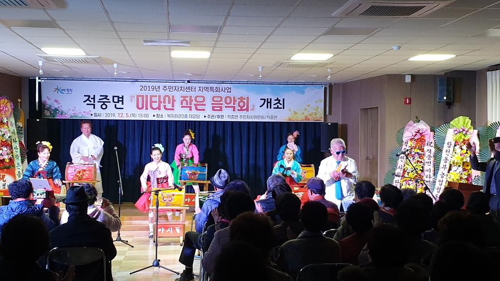 합천군 적중면 주민자치위원회(위원장 정문식)는 지난 5일 적중면복지회관 대강당에서 지역주민 300여명이 참석한 가운데 2019 주민자치센터 지역특화사업인 ‘미타산 작은 음악회’를 개최했다고 밝혔다.