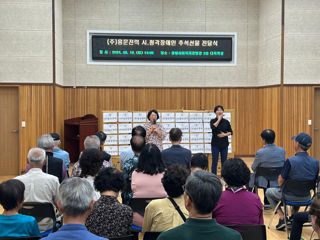 주식회사 용문전력(대표 이점용)은 10일, 추석 명절을 맞아 종합사회복지관 별관에서 시·청각 장애인을 위한 특별한 선물을 전달하는 시간을 가졌다. 이번 행사에서는 멸치 148박스와 후원금 200만 원을 관련 단체에 기부했다.