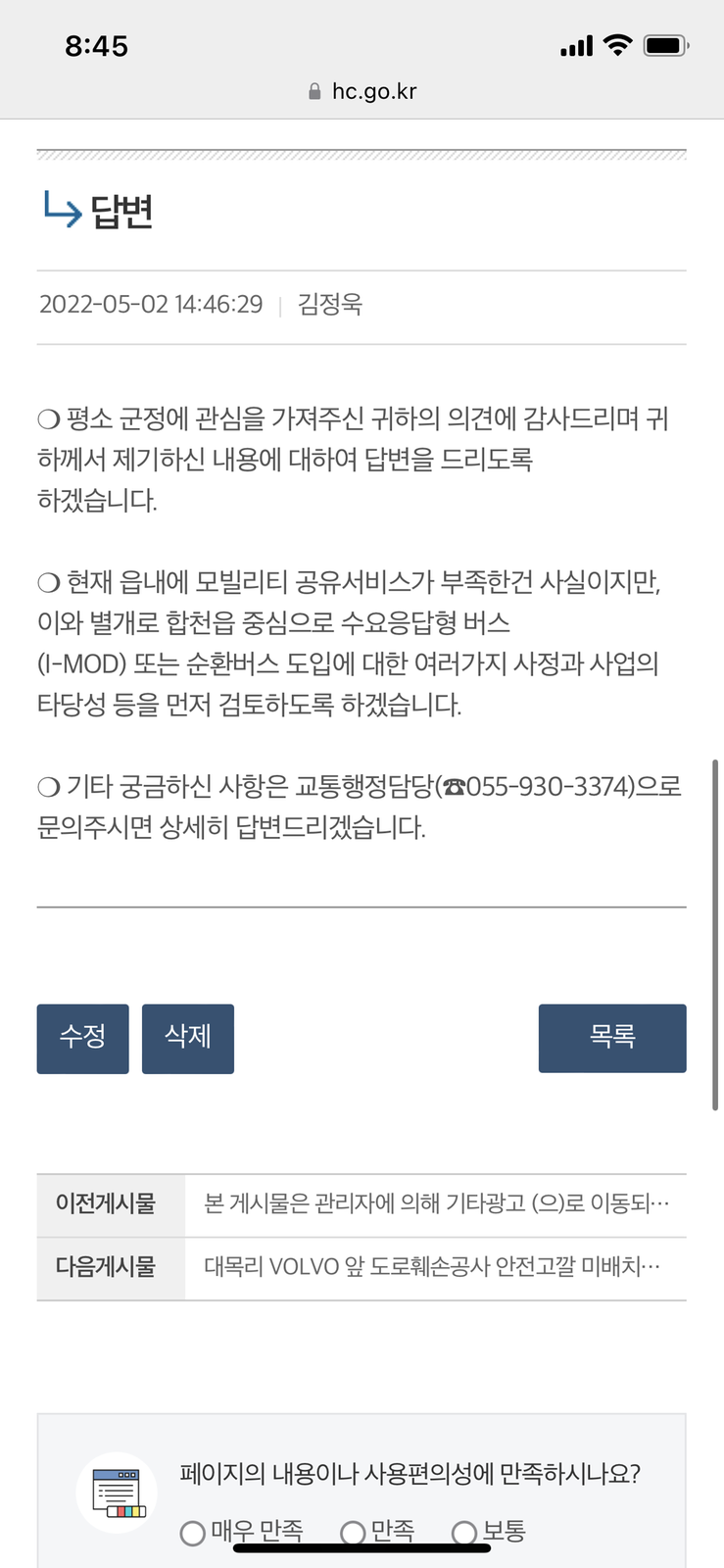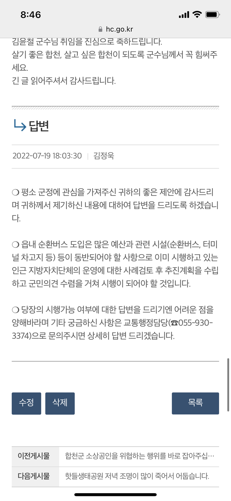 제가 순환버스 건의게시글을 올린 후 몇일뒤 한 군민분께서 의령의 순환버스 운행을 근거하여 게시글을 올렸는데 그분이랑 저의 게시글의 답변이 복사 붙여넣기 라도 한듯 똑같고 시간도 2분 차이밖에 안난다는 것에 대해.. 좀 실망스러웠습니다. 답변을 대충하신거 같은 느낌도 받았고 답변도 순환버스 도입 근거에 대한 의견에 대해 답변을 받을 줄 알았는데 게시글 내용과는 별개로 동일한 의견을 가진 다른 게시글을 비롯하여 답변이똑같네요. 내용과 다르게 답글이 달려 그냥 제목만 보고 답글을 다신 느낌을 받았습니다.