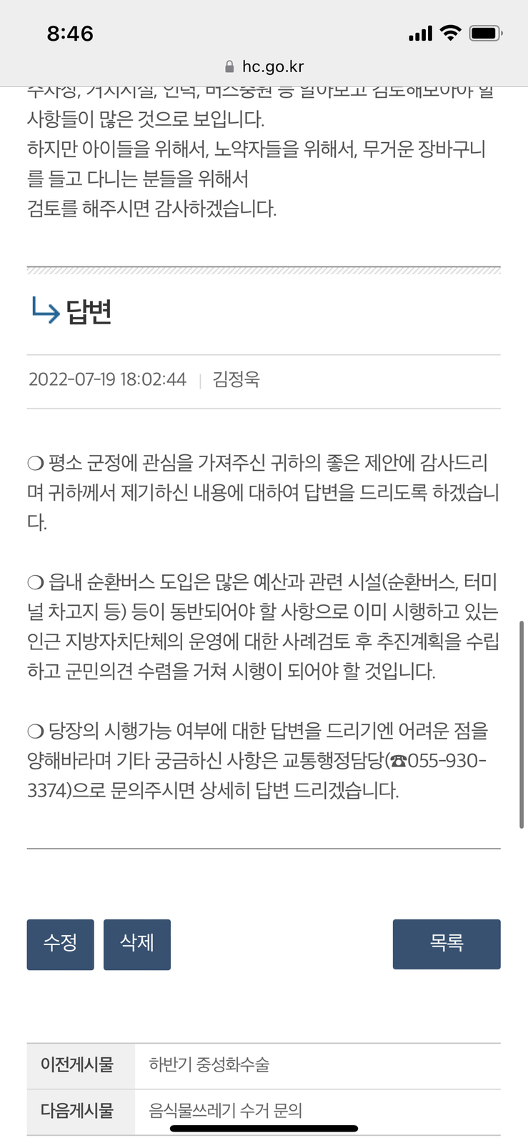 순환버스 관련 건의 답변 실망감이 있어 의견다시올랴요