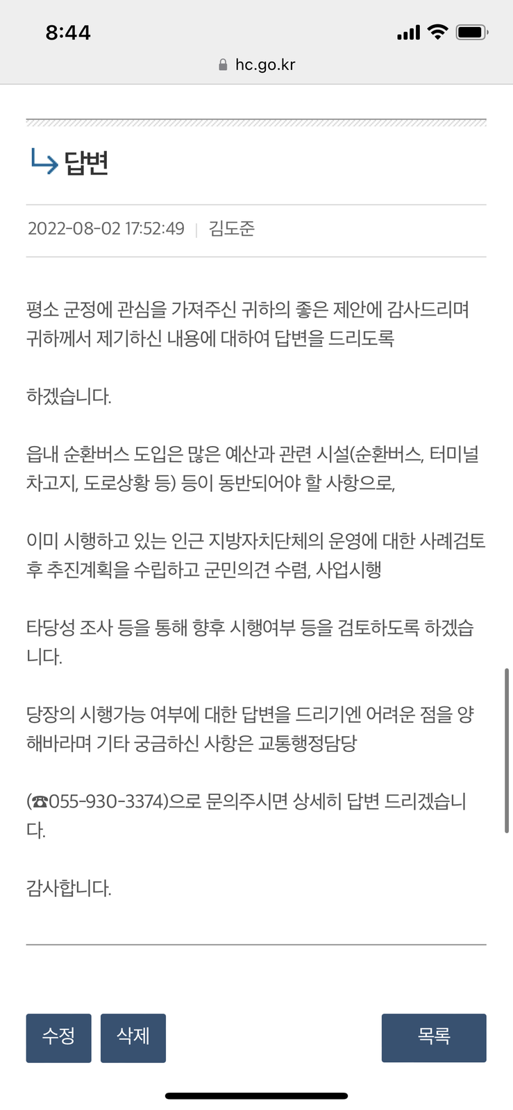 군민분께서 지방자치단체에 대한 사례를 보여주시고 다양하고 여러가지의 이유로 순환버스 도입 의견의 게시글이 많았는데 이러한 다양한 긍정적인 의견을 받으셨는데도 하나같이 똑같거나 유사한 답글...