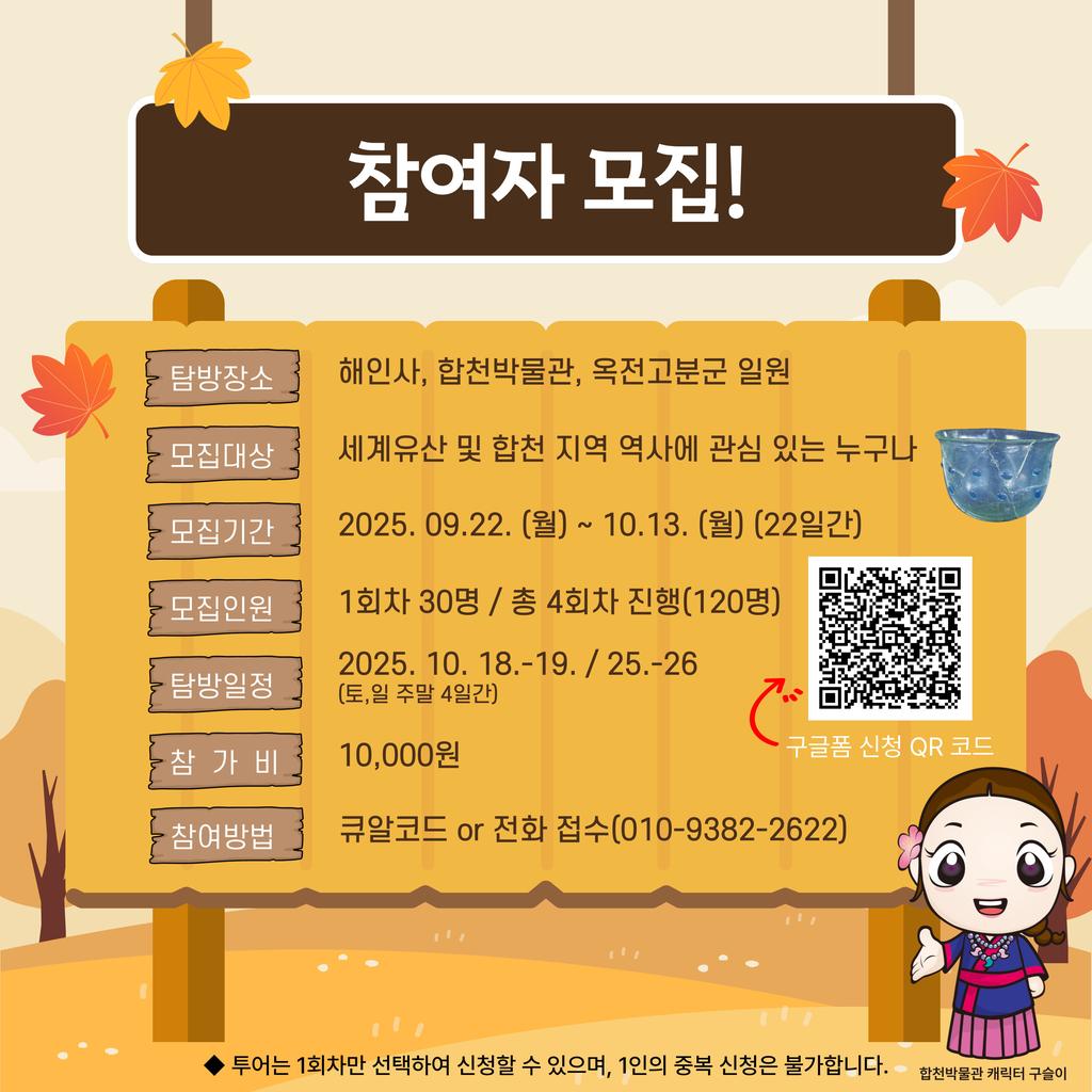옥전고분군의 세계유산 등재 2주년을 맞아 우리 지역 세계유산인 옥전고분군과 해인사 장경판전을 널리 알리는 한편, 지역주민 및 탐방객들에게 문화 향유 기회를 제공하고자 탐방 프로그램을 실시하오니 많은 분들의 관심과 참가 부탁드립니다.