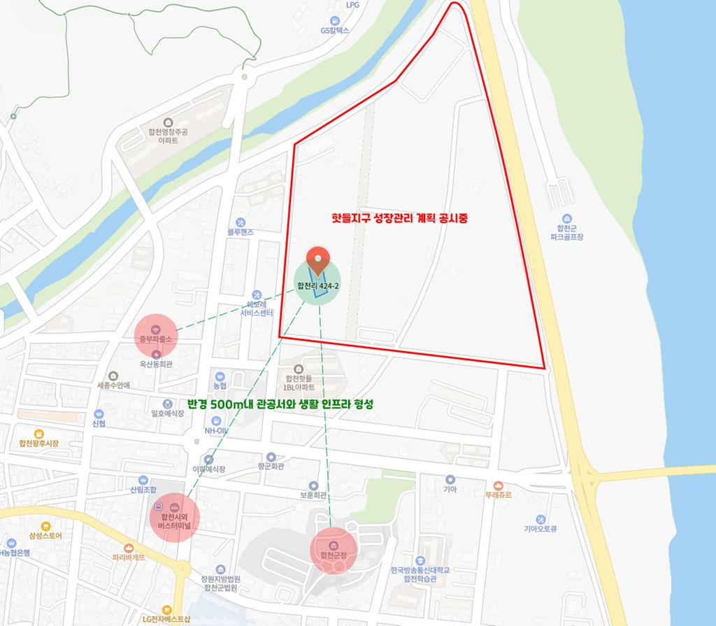 반경 500m 내에 합천군청, 파출소, 농협, 시외버스터미널 등의 생활인프라가 잡혀있는 합천 시내에 위치해 있습니다.