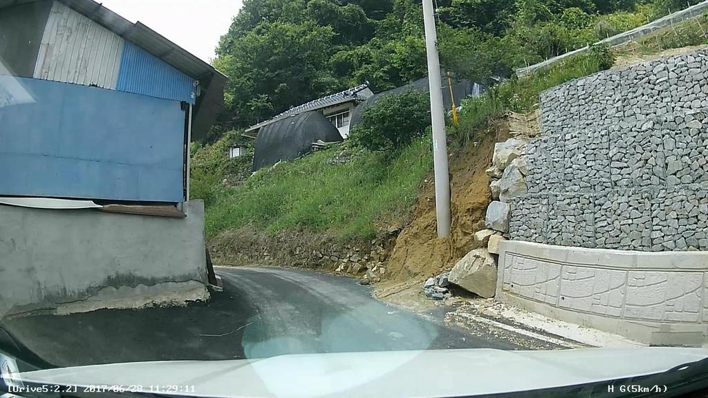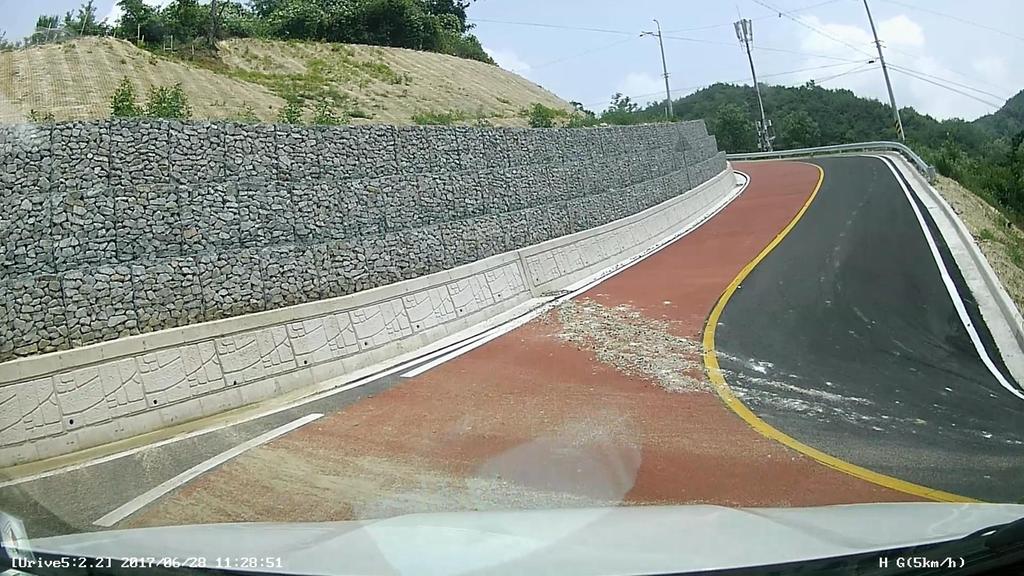 1. 수 일 전 마을에 장대비가 내렸습니다. 갓길 배수로로 유입되어야 할 빗물이 도로 노면을 통하여 흘러내려 노면에 나타난 흔적입니다. 사진에도 보이듯이 자갈이 아스콘 노면에 나뒹굴고 있는 상태입니다. 노면 돌멩이로 인하여 통행차량들에게 사고 위험에 대한 개연성이 다분하고 또한 차량 통행 시 돌멩이가 바퀴에 튕겨 보행자가 피해를 볼 수 도 있습니다. 배수로가 제 역할을 못하게 된 이유에 대하여 시설업자에게 확인해보니 예산운운하고 설계도면에 없다는 등 주민간의 민사 분쟁으로 휩쓸리기 싫다는 등 도로 확포장공사와 관계없는 말을 전해 들었습니다. 측구 쪽으로 배수로 설치를 하였다면 우수로 인해 돌멩이들이 노면 쪽으로 유입되지 않았을 것입니다. 그리고 이런 위험한 급경사지에 차량 운전자들을 위한 교통시설물(주의표시, 규제표시, 노면표시, 보조표시)이 설치되어 있지 않아 조속한 설치를 희망 합니다.