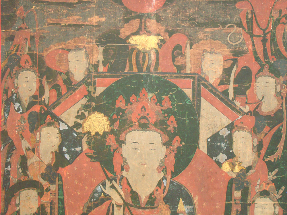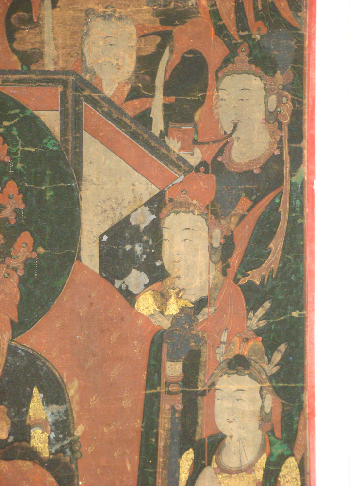 의복 채색에서도 주색과 석록색을 서로 대비되게 채색하고 있다. 제석천 좌우의 천인들 중 앞쪽 두 천인이 幢幡을 쥐고 서있고, 그 다음 천인들은 천도복숭아와 석류를 공양하거나 비파와 생황 등을 연주하고 있으며, 천동과 천녀가 시선을 밖으로 둔 모습으로 묘사되어 있다. 그리고 제석천 후면에는 간략하게 수묵산수화가 그려진 병풍이 펼쳐져 있으며, 여백에는 옅은 먹 등으로 구름처리하여 공간감을 자아낸 후 화면 상단 한 가운데에는 연꽃이 늘어뜨려져 있는 복장주머니가 표현되어 있기도 하다.