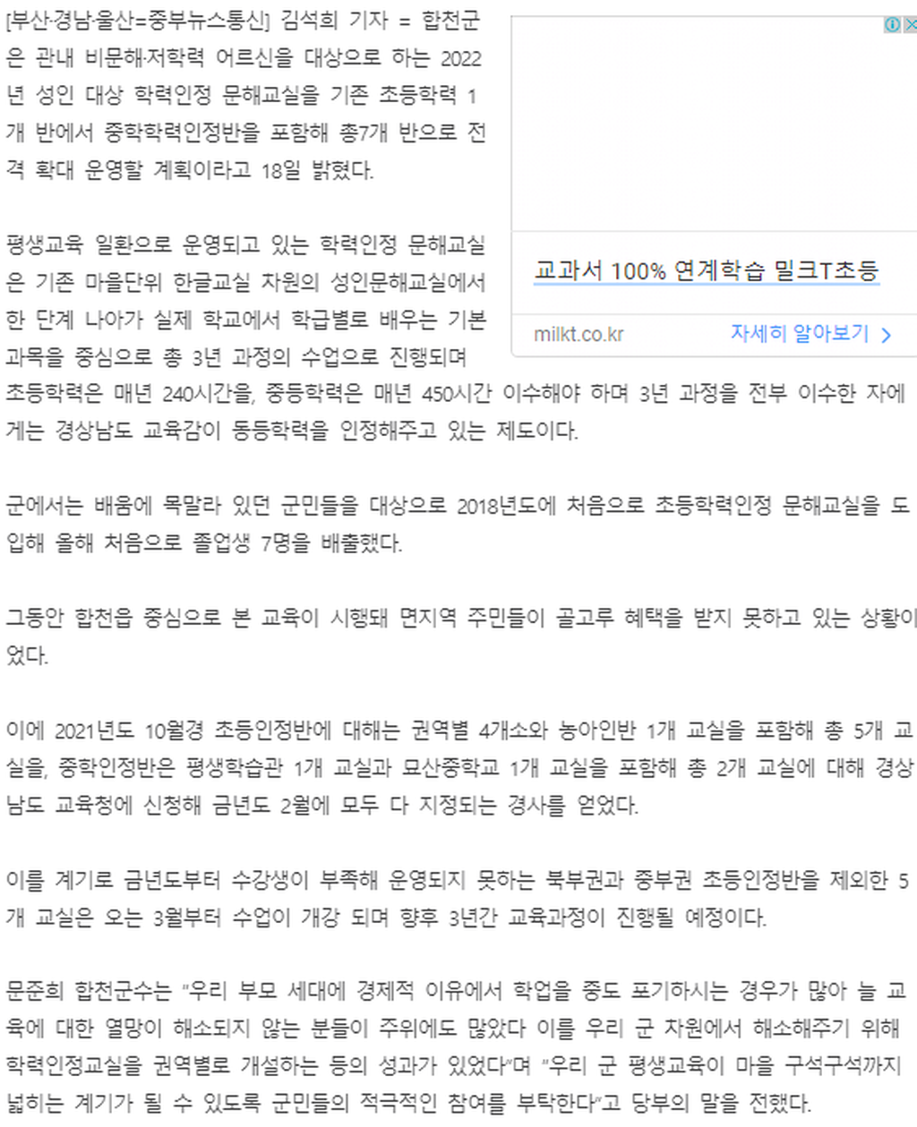 시민일보 "합천군 초등·중학 학력인정 문해교실 7개소 확대 개설 운영" https://www.siminilbo.co.kr/news/newsview.php?ncode=1160304729211742
