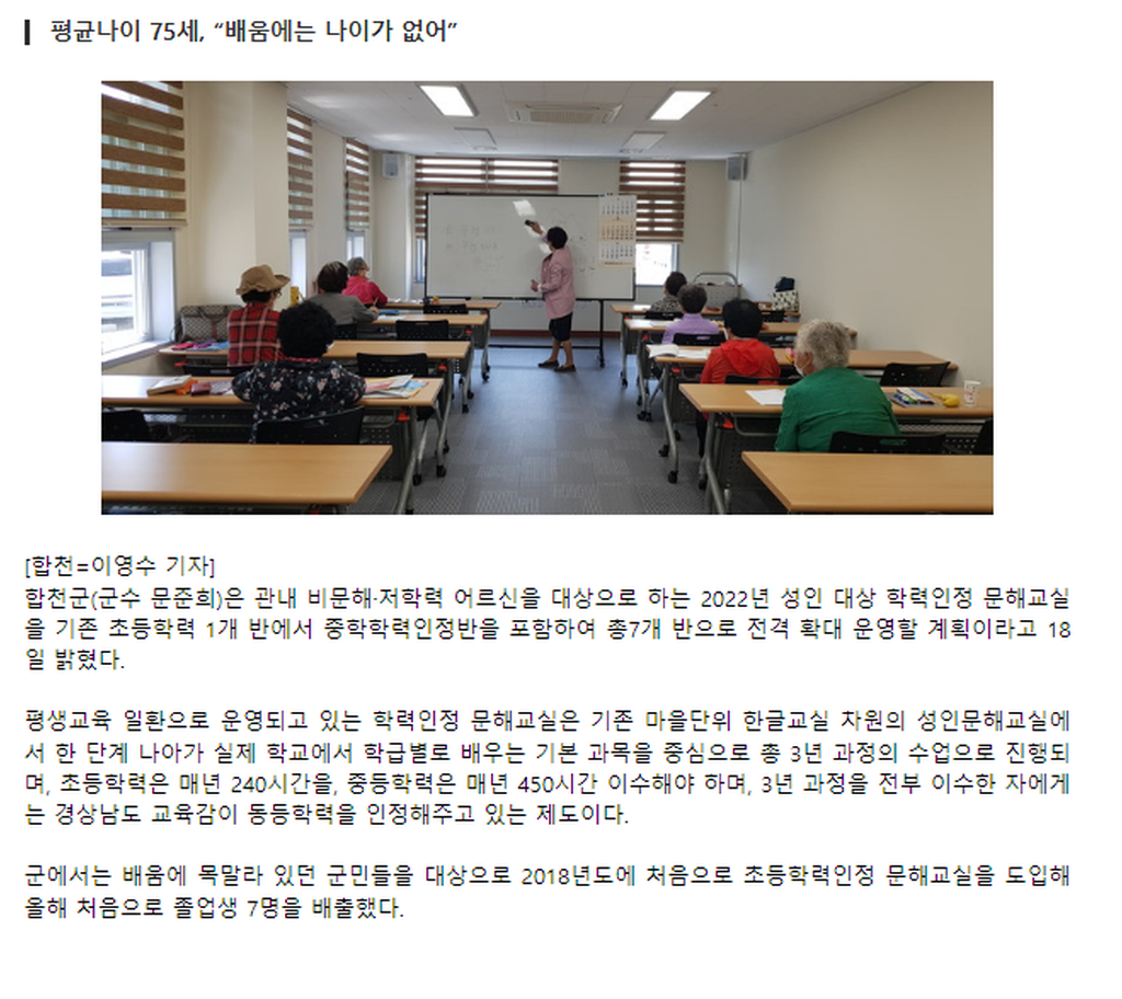 경남열린신문 "[합천] 평균나이 75세, “배움에는 나이가 없어”" http://www.gnopennews.com/news/articleView.html?idxno=88011